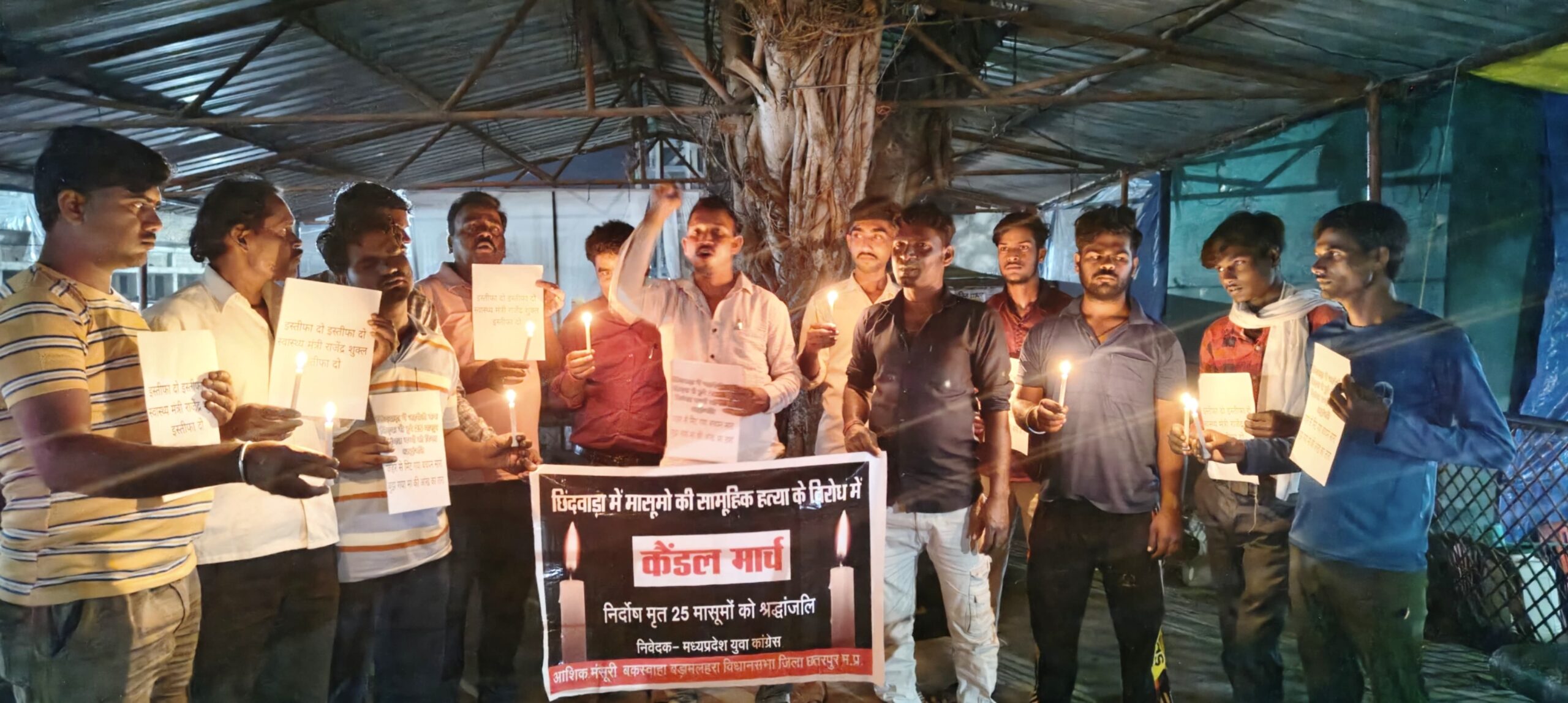 विनोद कुमार जैन बकस्वाहा । छिंदवाड़ा में ज़हरीली सिरप से 25 मासूम बच्चों की दर्दनाक मौत ने पूरे प्रदेश को झकझोर दिया है। इस अमानवीय लापरवाही के विरोध में बडामलहेरा विधानसभा क्षेत्र के ब्लॉक बकस्वाहा में युवा कांग्रेस द्वारा कैंडल मार्च निकाला गया। कैंडल मार्च का नेतृत्व युवा कांग्रेस प्रदेश सचिव आशिक मंसूरी ने किया। इस दौरान बड़ी संख्या में स्थानीय नागरिक, कांग्रेस कार्यकर्ता एवं जनप्रतिनिधि शामिल हुए। मार्च के दौरान सभी ने हाथों में जलती मोमबत्तियाँ लेकर मासूम बच्चों को श्रद्धांजलि दी और दोषियों पर कठोरतम कार्रवाई की मांग की।मार्च के अंत में मौन रखकर मृत मासूमों की आत्मा की शांति के लिए प्रार्थना की गई।